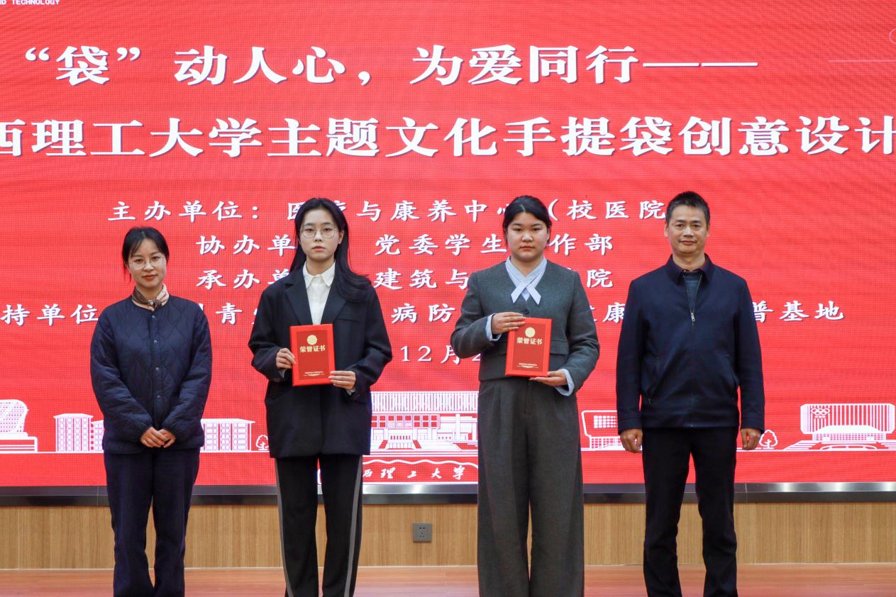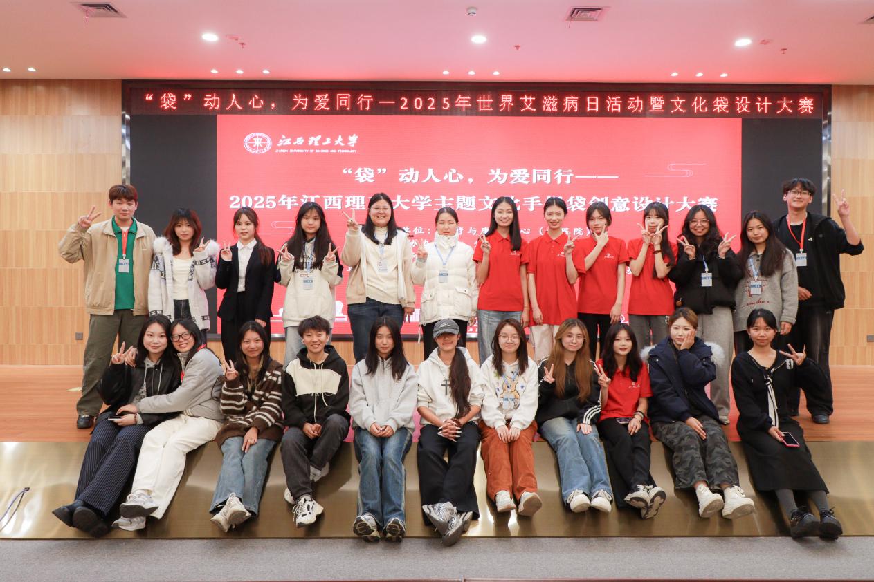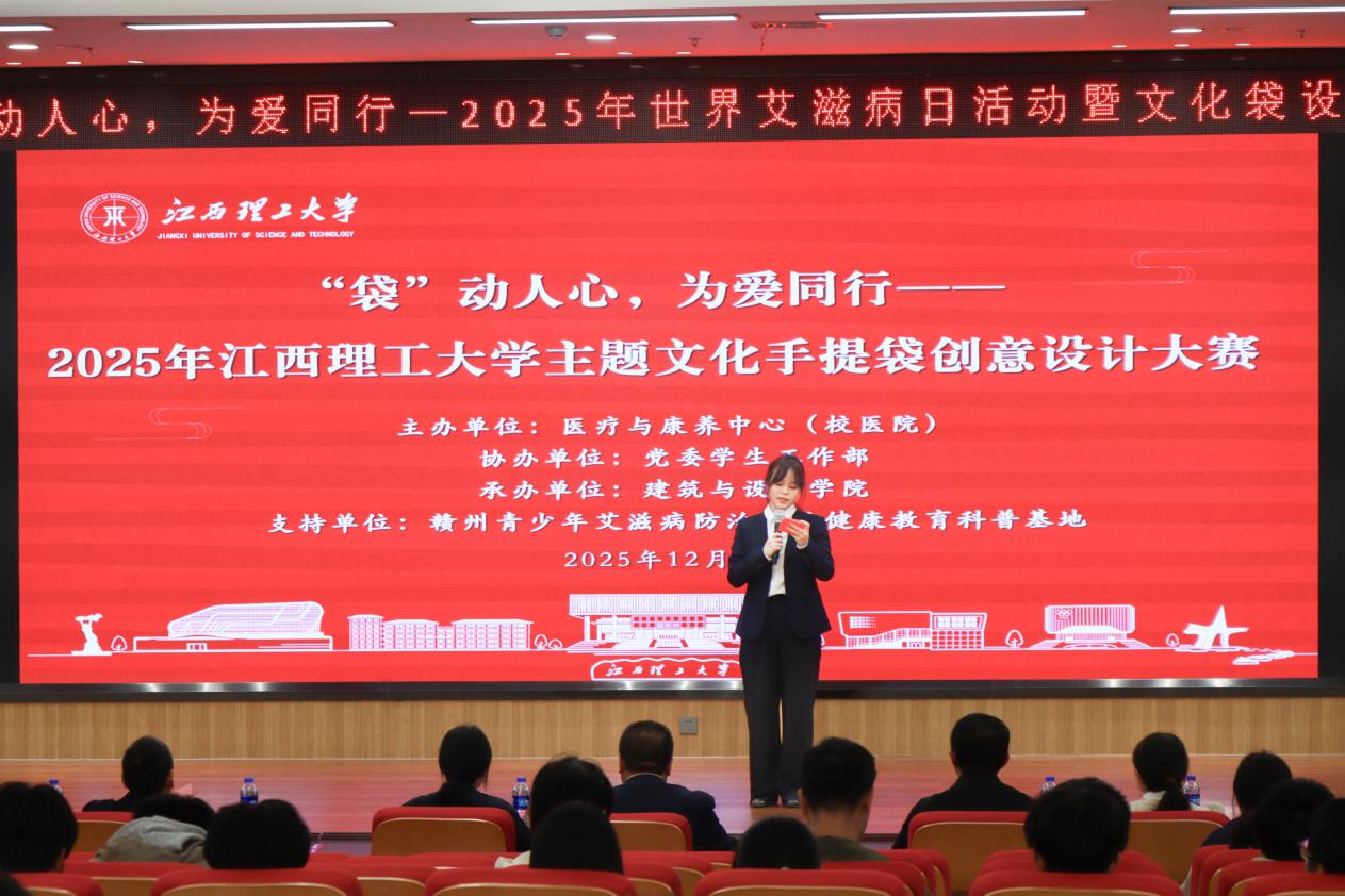 我院成功举办“袋”动人心防艾主题文化袋设计大赛 本网讯 12月2日,我院于图书馆报告厅举办“袋”动人心,为爱同行——2025年世界艾滋病日活动暨文化袋设计大赛。活动由校医院与学工部共同主办,建筑与设计学院承办,赣州市疾病预防控制中心艾防科科长杨荣荣、校团委副书记龙平、校医院院长周茂平、学工部副部长刘黎明、建筑与设计学院党委副书记刘现鹏、校医院院长助理刘段香、建筑与设计学院教师郭文瞻出席大赛,与参赛选手及学生代表共同参与此次活动。 现场首先介绍了专家组成的评审团,从主题契合度、创意艺术性、传播实用性及校园文化融合等维度对作品进行评审。15组入围选手依次上台展示讲解设计作品,阐述创作理念与防艾内涵,展现了我校学子将艺术表达与社会责任相结合的创意才华。 经过评审委员会打分合议,最终确定一、二、三等奖获奖名单。在颁奖环节中,建设学院党委副书记刘现鹏、校团委副书记龙平、校医院院长助理刘段香为三等奖获奖者颁奖;艾防科科长杨荣荣、学工部副部长刘黎明颁发二等奖;校医院院长周茂平为一等奖获得者颁奖,并合影留念。 一等奖获得者发表了获奖感言,分享创作过程中的思考与对防艾公益的理解。随后,全体师生共同进行了防艾志愿者宣誓,承诺积极学习防艾知识、传递健康理念,用实际行动承担社会责任。 最后,活动在集体合影中圆满落幕。此次大赛以“袋”为载体,以生动形式传播了防艾知识,强化了师生“携手抗艾、共担责任”的意识,体现了学校持续推进健康教育与校园文化建设的显著成效。 (文/杜洛笙 阳诗雨 图/秦筱语 编/梁慧晨)
