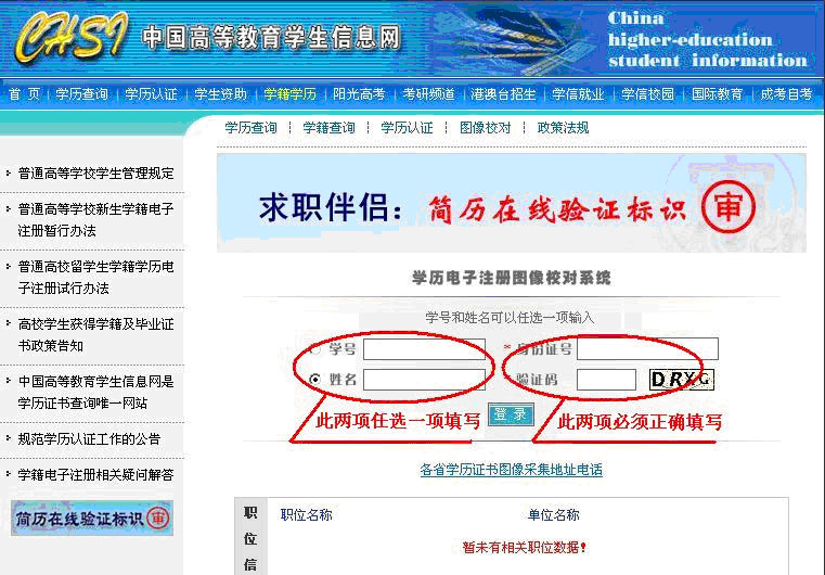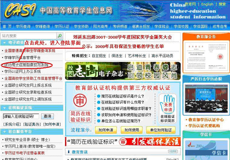 1、在浏览器地址栏输入中国高等教育学生信息网网址:http://www.chsi.com.cn/,进入首页面后,点击左边导航栏处的“学历电子注册图像校队系统”,进入登陆窗口,如图一所示。