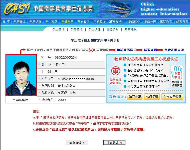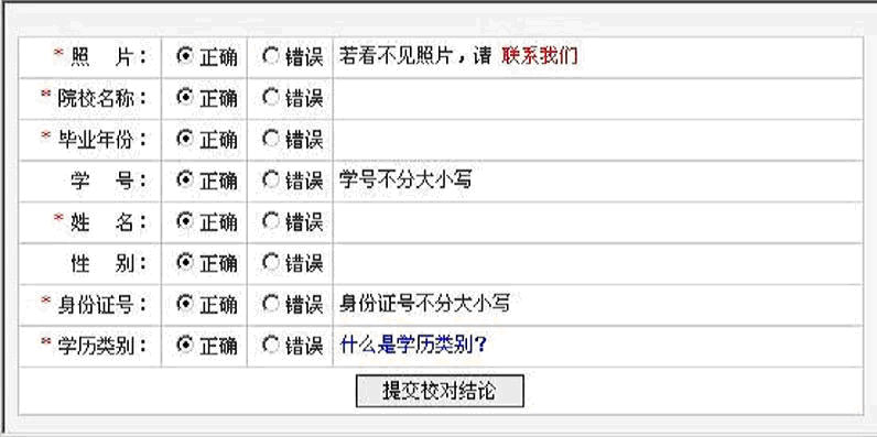 4、在信息校对窗口中,请务必仔细核对各项信息,核对无误后点击“信息无误√”按钮,信息核对成功!若信息有误,请点击“信息有误×”按钮,在需要修改的内容后面点击“错误”选项并修改,然后点击“提交校对结论”按钮,如图四所示。