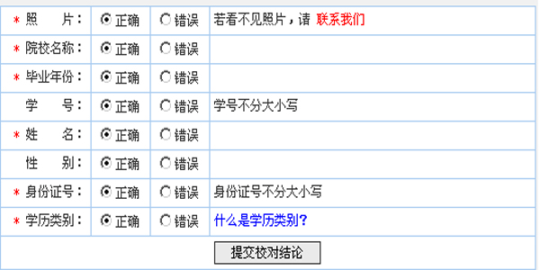 4、 在信息校对窗口中,请务必仔细核对各项信息,核对无误后点击“信息无误√”按钮,信息核对成功!若信息有误,请点击“信息有误×”按钮,在需要修改的内容后面点击“错误”选项并修改,然后点击“提交校对结论”按钮,如图四所示。