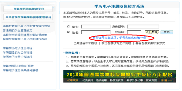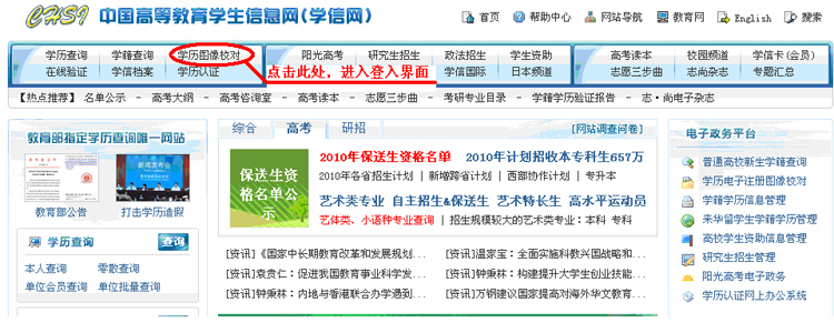 1、 在浏览器地址栏输入中国高等教育学生信息网网址:http://www.chsi.com.cn/,进入首页面后,点击顶端导航栏处的“学历图像校对”,进入登陆窗口,如图一所示。