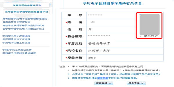 3、 信息输入完毕后,点击“登陆”按钮,进入“学历电子注册图像采集的有关信息”窗口,如图三所示。